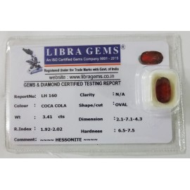 REPORT NO . LH 160CLARITY . N/ACOLOUR . COCA COLASHAPE / CUT . OVALWT . 3.41 CTSDIMENSION . 2-1.7-1.4-3.R . INDEX . 1.92-2.02HARDNESS . 6.5-7.5COMMENT . HESSONITE..