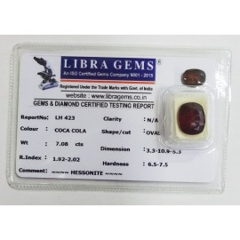 REPORT.NO.-LH 423CLARITY.-N/ACOLOUR.-COCA COLASHAPE/CUT.-OVALWT.-7.08 CTSDIMENSION.-3-3.10-9.5-3.R.INDEX.-1.92-2.02HARDNESS.-6.5-7.5COMMENT.-HESSONITE..