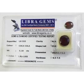REPORT.NO.-LH 555CLARITY.-N/ACOLOUR.-COCA COLASHAPE/CUT.-OVALWT.-5.18 CTSDIMENSION.-10-3.9-7.5-4.R.INDEX.-1.92-2.02HARDNESS.-6.5-7.5COMMENT.HESSONITE..