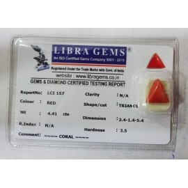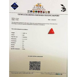 REPORT NO . LCI 157CLARITY . N/ACOLOUR . REDSHAPE / CUT . TRIANGLEWT . 4.41 CTSDIMENSION . 2-4.1-4.5-4.R . INDEX . N/AHARDNESS . 3.5COMMENT . CORAL..