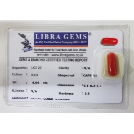 REPORT.NO.-LCI 470CLARITY.-N/ACOLOUR.-REDSHAPE/CUT.-CAPSULEWT.-3.76 CTSDIMENSION.-4.7-5.5-4.9R.INDEX.-N/AHARDNESS.-3.5COMMENT.-CORAL..