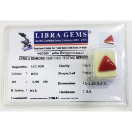 REPORT.NO.LCI 428CLARITY.N/ACOLOUR.REDSHAPE/CUT.TRIANGLEWT.3.46 CTSDIMENSION.1.1-10.5-4.7R.INDEX.N/AHARDNESS.3.5COMMENT.CORAL..