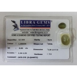 REPORT NO . LC 193CLARITY . N/ACOLOUR . L . GREENSHAPE / CUT . OVALWT . 8.00 CTSDIMENSION . 3-8.1-5.7-5.R . INDEX . 1.54-1.55HARDNESS . 7.5COMMENT . CATS EYE { S . QUARTZ }..