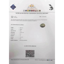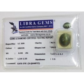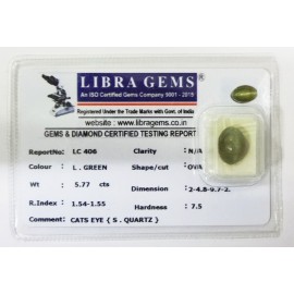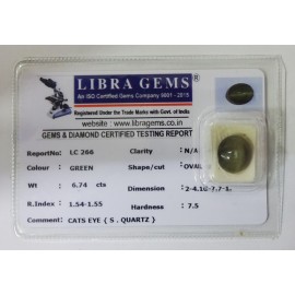 REPORT.NO.-LC 700CLARITY.-N/ACOLOUR.-GREENSHAPE/CUT.-OVALWT.-3.74 CTSDIMENSION.-10-3.9-2.5-5.R.INDEX.- 1.54-1.55HARDNESS.-7.5COMMENT.-CATS EYE { S . QUARTZ }..