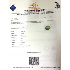 REPORT.NO.LC 406CLARITY.N/ACOLOUR.L.GREENSHAPE/CUT.OVALWT.5.77 CTSDIMENSION.2.4-8.9-7.2R.INDEX.1.54-1.55HARDNESS.7.5COMMENT.CATS EYE {S.QUARTZ}..