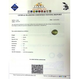 DATE:13-10-2023REF.NO:LC 985NAME:CATS EYE WEIGHT:2.90 CTSCOLOUR:GREENTYPE OF/CUT:OVALDIMENSION:9.4-8.9-5.5CONCLUSION:N/AHARDNESS:7.5R.INDEX:1.54-1.55CLARITY:N/ASPECIFIC COMMENTS:CATS EY..
