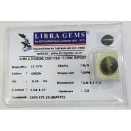 REPORT.NO.-LC 470CLARITY.-N/ACOLOUR.-GREENSHAPE/CUT.-OVALWT.-8.48 CTSDIMENSION.-2-6.1-7.8-2.R.INDEX.-1.54-1.55HARDNESS.-7.5COMMENT.-CATS EYE { S . QUARTZ }..