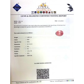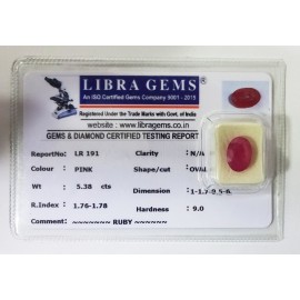 REPORT NO . LR 191CLARITY . N/ACOLOUR . PINKSHAPE / CUT . OVALWT . 5.38 CTSDIMENSION . 1-1.7-9.5-6.R . INDEX . 1.76-1.78HARDNESS . 9.0COMMENT . RUBY..
