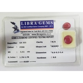REPORT.NO.-LR 355CLARITY.-N/ACOLOUR.-PINKSHAPE/CUT.-ROUNDWT.-5.51 CTSDIMENSION.-9.9-9.3-5.4R.INDEX.-1.76-1.78HARDNESS.-9.0COMMENT.-RUBY..