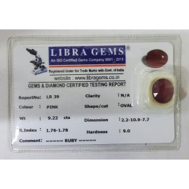 REPORT NO . LR 39CLARITY . N/ACOLOUR . PINKSHAPE / CUT . OVALWT . 9.22 CTSDIMENSION . 2-2.10-9.7-7.R . INDEX . 1.76-1.78HARDNESS . 9.0COMMENT . RUBY..