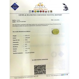 REPORT NO . LY 134CLARITY . N/ACOLOUR . YELLOWSHAPE / CUT . OVALWT . 5.78 CTSDIMENSION . 2-2.8-3.5-4.R . INDEX . 1.76-1.78HARDNESS . 9.0COMMENT . YELLOW SAPPHIRE..
