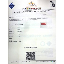 DATE:22-8-2024REF.NO:LCI 1263NAME:CORALWEIGHT:3.47 CTSCOLOUR:REDTYPE OF/CUT:CAPSULEDIMENSION:8.7-5.3-4.9CONCLUSION:N/AHARDNESS:3.5R.INDEX:N/ACLARITY:N/ASPECIFIC COMMENTS:CORAL..