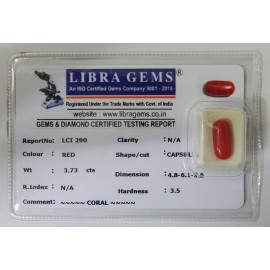 REPORT NO . LCI 290CLARITY . N/ACOLOUR . REDSHAPE / CUT . CAPSULEWT . 3.73 CTSDIMENSION . 4-8.6-1.3-6.R . INDEX . N/AHARDNESS . 3.5COMMENT . CORAL..