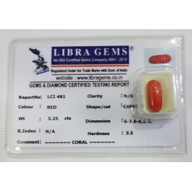 REPORT.NO.LCI 481CLARITY.N/ACOLOUR.REDSHAPE/CUT.CAPSULEWT.5.25 CTSDIMENSION.5.7-6.8-5.5R.INDEX.N/AHARDNESS.3.5COMMENT.CORAL..