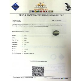 DATE:13-10-2023REF.NO:LC 1008NAME:CATS EYE WEIGHT:5.83 CTSCOLOUR:GREENTYPE OF/CUT:OVALDIMENSION:1.7-8.3-8.2CONCLUSION:N/AHARDNESS:7.5R.INDEX:1.54-1.55CLARITY:N/ASPECIFIC COMMENTS:CATS E..