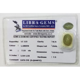 REPORT NO . LC 115CLARITY . N/ACOLOUR . L . GREENSHAPE / CUT . OVALWT . 7.33 CTSDIMENSION . 9-9.8-1.3-1.R . INDEX . 1.54-1.55HARDNESS . 7.5COMMENT . CATS EYE { S . QUARTZ }..