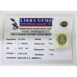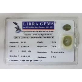 REPORT NO . LC 12CLARITY . N/ACOLOUR . L . GREENSHAPE / CUT . OVALWT . 6.60 CTSDIMENSION . 2-8.10-1.7-8.R . INDEX . 1.54-1.55HARDNESS . 7.5COMMENT . CATS EYE { S . QUARTZ }..
