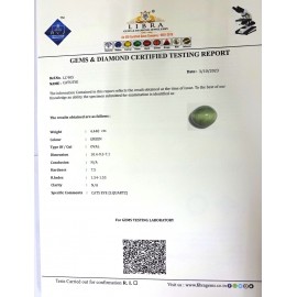 REPORT.NO.LC 456CLARITY.N/ACOLOUR.L.GREENSHAPE/CUT.OVALWT.8.37 CTSDIMENSION.2.8-1.3-8.2R.INDEX.1.54-1.55HARDNESS.7.5COMMENT.CATS EYE {S.QUARTZ}..