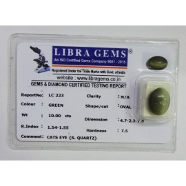REPORT NO . LC 223CLARITY . N/ACOLOUR . GREENSHAPE / CUT . OVALWT . 10.00 CTSDIMENSION . 4-7.2-3.7-6.R . INDEX . 1.54-1.55HARDNESS . 7.5COMMENT . CATS EYE { S . QUARTZ }..