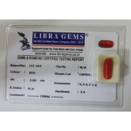 REPORT NO . LCI 294CLARITY . N/ACOLOUR . REDSHAPE / CUT . CAPSULEWT . 3.80 CTSDIMENSION . 5-3.5-7.4-6.R . INDEX . N/AHARDNESS . 3.5COMMENT . CORAL..