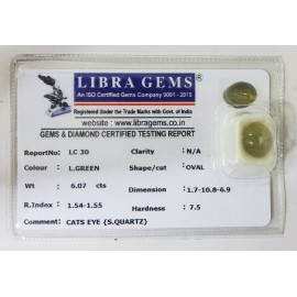 REPORT NO . LC 30CLARITY . N/ACOLOUR . L . GREENSHAPE / CUT . ROUNDWT . 6.07 CTSDIMENSION . 1-7.10-8.6-9.R . INDEX . 1.54-1.55HARDNESS . 7.5COMMENT . CATS EYE { S . SQUARTZ }..