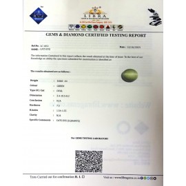 REPORT.NO.-LC 737CLARITY.-N/ACOLOUR.-GREENSHAPE/CUT.-OVALWT.-4.32 CTSDIMENSION.-1-8.9-5.6-6.R.INDEX.- 1.54-1.55HARDNESS.-7.5COMMENT.-CATS EYE { S . QUARTZ }..