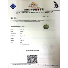 REPORT NO . LC 181CLARITY . N/ACOLOUR . L . GREENSHAPE / CUT . OVALWT . 4.36 CTSDIMENSION . 10-7.9-2.6-2.R . INDEX . 1.54-1.55HARDNESS . 7.5COMMENT . CATS EYE { S . QUARTZ }..