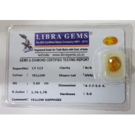 REPORT NO . LY 113CLARITY . N/ACOLOUR . YELLOWSHAPE / CUT . OVALWT . 3.60 CTSDIMENSION .9-7.7-5.5-4.R . INDEX . 1.76-1.78HARDNESS . 9.0COMMENT . YELLOW SAPPHIRE..