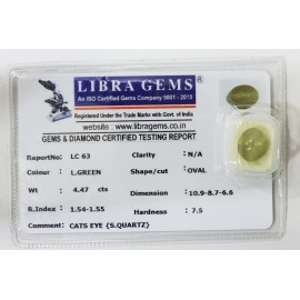REPORT NO . LC 63CLARITY . N/ACOLOUR . L . GREENSHAPE / CUT . OVALWT . 4.47 CTSDIMENSION . 10-9.8-7.6-6.R . INDEX . 1.54-1.55HARDNESS . 7.5COMMENT . CATS EYE { S . QUARTZ }..