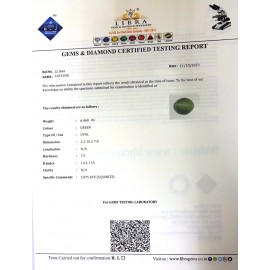 REPORT.NO.-LC 530CLARITY.-N/ACOLOUR.-L . GREENSHAPE/CUT.-OVALWT.-10.41 CTSDIMENSION.-3-8.2-1.8-6.R.INDEX.-1.54-1.55HARDNESS.-7.5COMMENT.-CATS EYE { S . QUARTZ }..