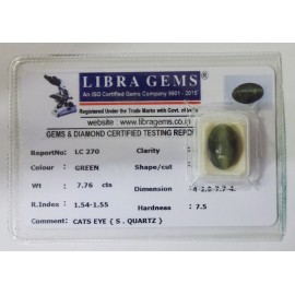 REPORT NO . LC 270CLARITY . N/ACOLOUR . GREENSHAPE / CUT . OVALWT . 7.76 CTSDIMENSION . 4-2.9-7.7-4.R . INDEX . 1.54-1.55HARDNESS . 7.5COMMENT . CATS EYE { S . QUARTZ }..