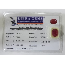 REPORT NO . LR 142CLARITY . N/ACOLOUR . PINKSHAPE / CUT . OVALWT . 5.10 CTSDIMENSION . 1-3.9-1.4-7.R . INDEX . 1.76-1.78HARDNESS . 9.0COMMENT . RUBY..