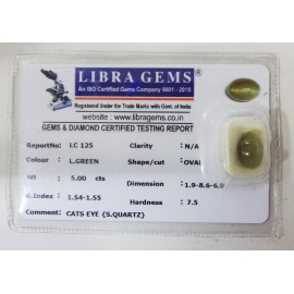 REPORT NO . LC 125CLARITY . N/ACOLOUR . L . GREENSHAPE / CUT . OVALWT . 5.00 CTSDIMENSION . 1-9.8-6.6-9.R . INDEX . 1.54-1.55HARDNESS , 7.5COMMENT . CATS EYE { S . QUARTZ }..