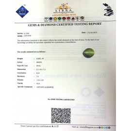 DATE:15-8-2024REF.NO:LCK 22NAME:CATS EYEWEIGHT:2.67 CTSCOLOUR:L.GREENTYPE OF/CUT:OVALDIMENSION:9.1-6.3-4.6CONCLUSION:N/AHARDNESS:7.5R.INDEX:1.54-1.55CLARITY:N/ASPECIFIC COMMENTS:CATS EYE {K}..