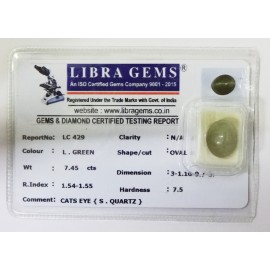 REPORT.NO.-LC 494CLARITY.-N/ACOLOUR.-L . GREENSHAPE/CUT.-OVALWT.-6.22 CTSDIMENSION.-2-4.9-7.7-8.R.INDEX.-1.54-1.55HARDNESS.-7.5COMMENT.-CATS EYE { S . QUARTZ }..