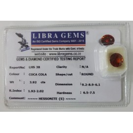 REPORT NO . LHS 38CLARITY . N/ACOLOUR . COCA COLASHAPE / CUT . ROUNDWT . 3.92 CTSDIMENSION . 9-2.8-9.6-1.R . INDEX . 1.92-2.02HARDNESS . 6.5-7.5COMMENT . HESSONITE { S }..