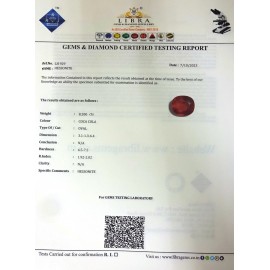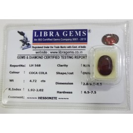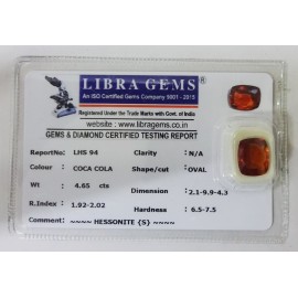 REPORT.NO.LH 568 CLARITY.N/A COLOUR.COCA COLA SHAPE/CUT.OVALWT.4.72 CTS DIMENSION.2.8-9.1-4.5R.INDEX.1.92-2.02HARDNESS.6.5-7.5COMMENT.HESSONITE..