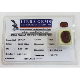 REPORT.NO.-LH 427CLARITY.-N/ACOLOUR.-COCA COLASHAPE/CUT.-OVALWT.-5.05 CTSDIMENSION.-4-2.10-8.3-3.R.INDEX.-1.92-2.02HARDNESS.-6.5-7.5COMMENT.-HESSONITE..