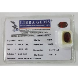 REPORT NO .  LH 95CLARITY . N/ACOLOUR . COCA COLASHAPE / CUT . OVALWT . 4.06 CTSDIMENSION . 2-1.7-7.4-8.R . INDEX . 1.92-2.02HARDNESS . 6.5-7.5COMMENT . HESSONITE..