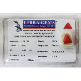 REPORT.NO.LCI 654CLARITY.N/ACOLOUR.REDSHAPE/CUT.TRIANGLEWT.4.46 CTSDIMENSION.4.46 CTSR.INDEX.N/AHARDNESS.3.5COMMENT.CORAL..
