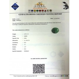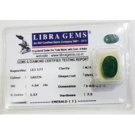 REPORT.NO.-LEJ 177CLARITY.-N/ACOLOUR.-GREENSHAPE/CUT.-OVALWT.-4.84 CTSDIMENSION.-3-6.9-2.5-4.R.INDEX.-1.57HARDNESS.-7.5COMMENT.-EMERALD { J }..