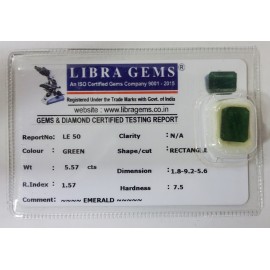 REPORT NO . LE 50CLARITY . N/ACOLOUR . GREENSHAPE / CUT . RECTANGLEWT . 5.57 CTSDIMENSION . 1-8.9-2.5-6.R . INDEX . 1.57HARDNESS . 7.5COMMENT . EMERALD..