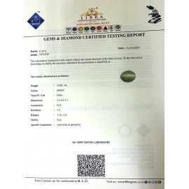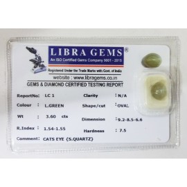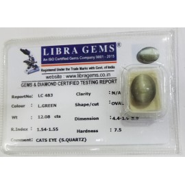 REPORT.NO.- LC 483CLARITY.-N/ACOLOUR.-L . GREENSHAPE/CUT.-OVALWT.-12.08 CTSDIMENSION.-4-4.1-9.8-9.R.INDEX.-1.54-1.55HARDNESS.-7.5COMMENT.-CATS EYE { S . QUARTZ }..
