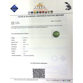 REPORT.NO.-LC 584CLARITY.-N/ACOLOUR.-L.GREENSHAPE/CUT.-OVALWT.-9.28 CTSDIMENSION.-3-3.2-1.8-5.R.INDEX.-1.54-1.55HARDNESS.-7.5COMMENT.-CATS EYE { S . QUARTZ }..
