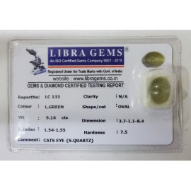 REPORT NO . LC 133CLARITY . N/ACOLOUR . L . GREENSHAPE / CUT . OVALWT . 9.16 CTSDIMENSION . 3-7.1-1.8-4.R . INDEX . 1.54-1.55HARDNESS . 7.5COMMENT . CATS EYE { S . QUARTZ }..