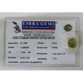 REPORT NO . LC 168CLARITY . N/ACOLOUR . L . GREENSHAPE / CUT . OVALWT . 7.03 CTSDIMENSION . 1-8.10-6.7-9.R . INDEX . 1.54-1.55HARDNESS . 7.5COMMENT . CATS EYE { S . QUARTZ }..