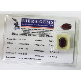 REPORT.NO.-LH 239CLARITY.-N/ACOLOUR.-COCA COLASHAPE/CUT.-OVALWT.-5.48 CTSDIMENSION.-1.7-8.2-6.7R.INDEX.-1.92-2.02HARDNESS.-6.5-7.5COMMENT.-HESSONITE..