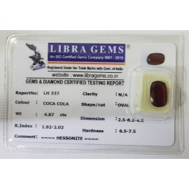 REPORT.NO.-LH 337CLARITY.-N/ACOLOUR.-COCA COLASHAPE/CUT.-OVALWT.-4.87 CTSDIMENSION.-2-5.8-2.4-5.R.INDEX.-1.92-2.02HARDNESS.-6.5-7.5COMMENT.-HESSONITE..