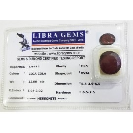 REPORT.NO.-LH 473CLARITY.-N/ACOLOUR.-COCA COLASHAPE/CUT.-OVALWT.-12.66 CTSDIMENSION.-5-5.3-9.5-5.R.INDEX.-1.92-2.02HARDNESS.-6.5-7.5COMMENT.-HESSONITE..