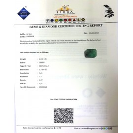 DATE:11-10-2023REF.NO:LE 963NAME:EMERALDWEIGHT:4.33 CTSCOLOUR:GREENTYPE OF/CUT:RECTANGLEDIMENSION:1-3.8-6.5-2.CONCLUSION:N/AHARDNESS:7.5R.INDEX:1.57CLARITY:N/ASPECIFIC COMMENTS:EMERALD..